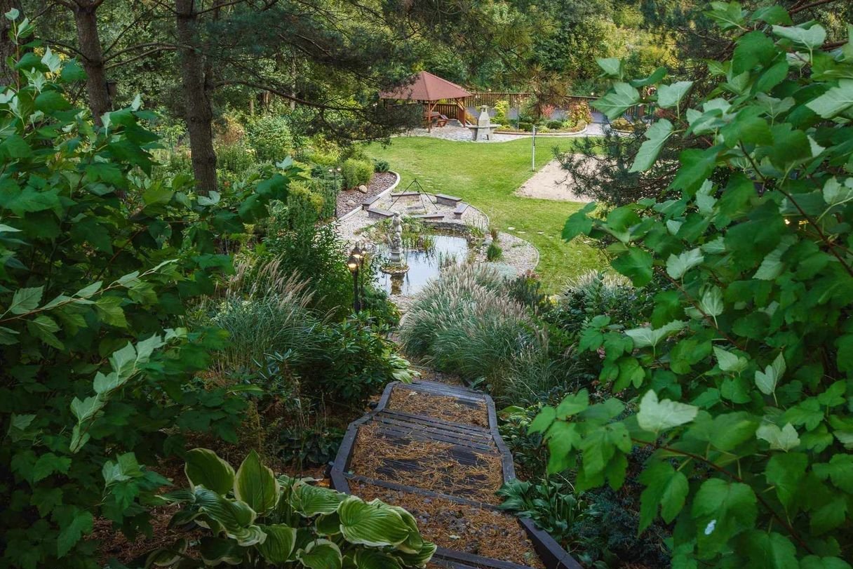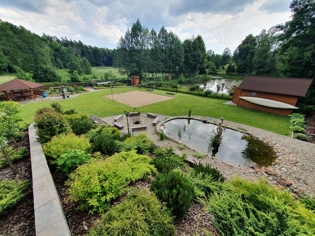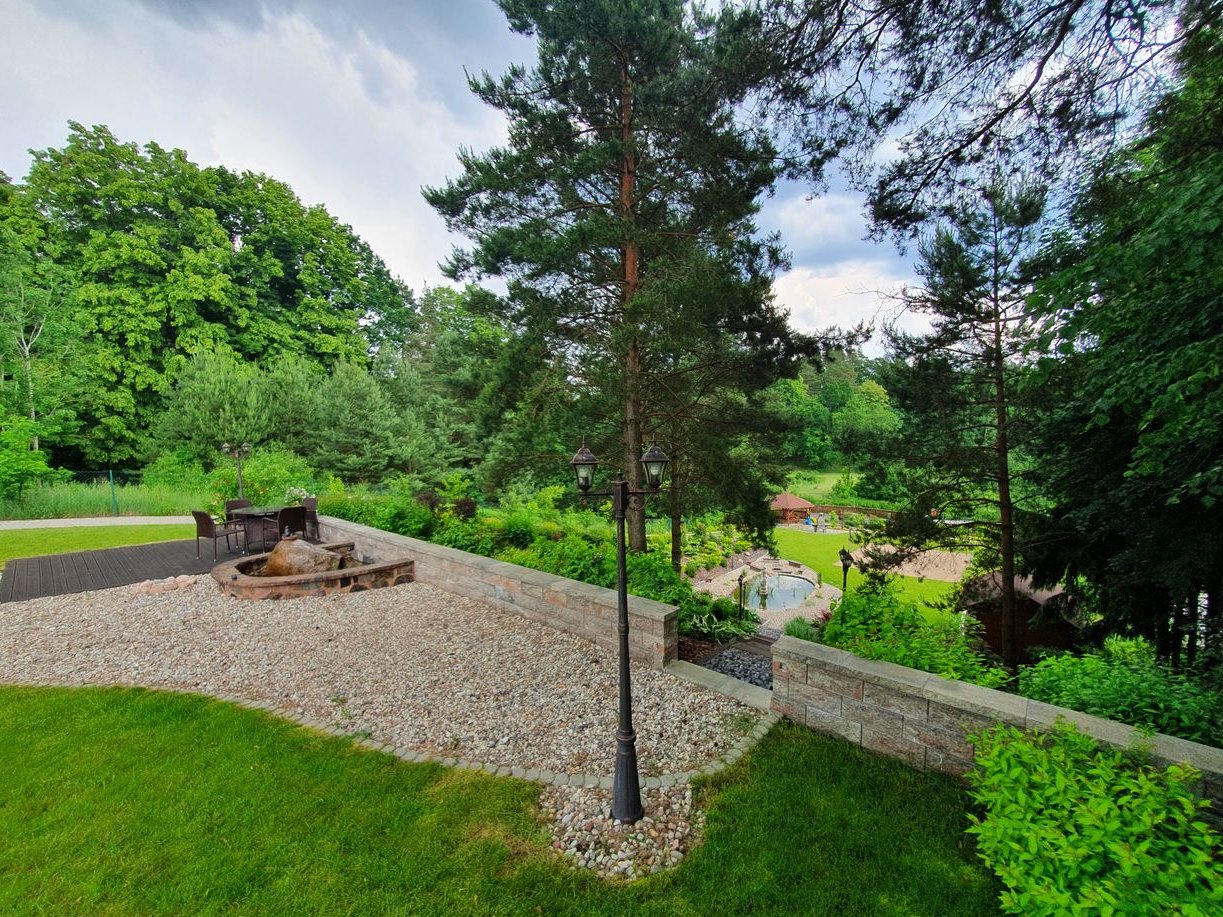 Na działce znajduje się altana, duży taras, plac zabaw dla dzieci, miejsce do grillowania oraz jacuzzi. Ogród jest przepięknie zagospodarowany w drzewa, ozdobne krzewy, kwiaty, elementy dekoracyjne oraz fontannę, oczko wodne, strumyk biegnący po skarpie i wpadający do wcześniej wspomnianego oczka wodnego.