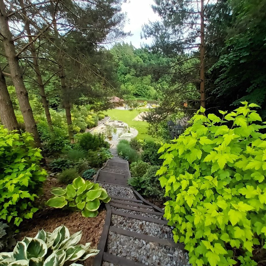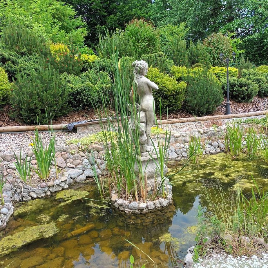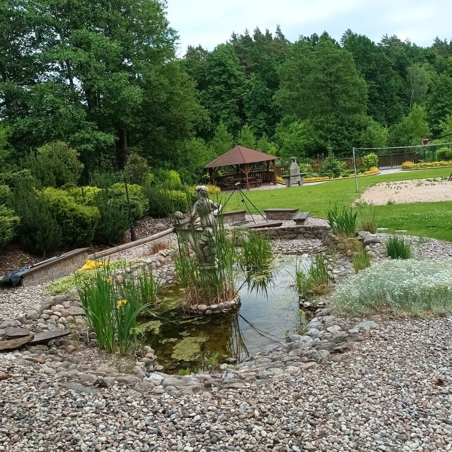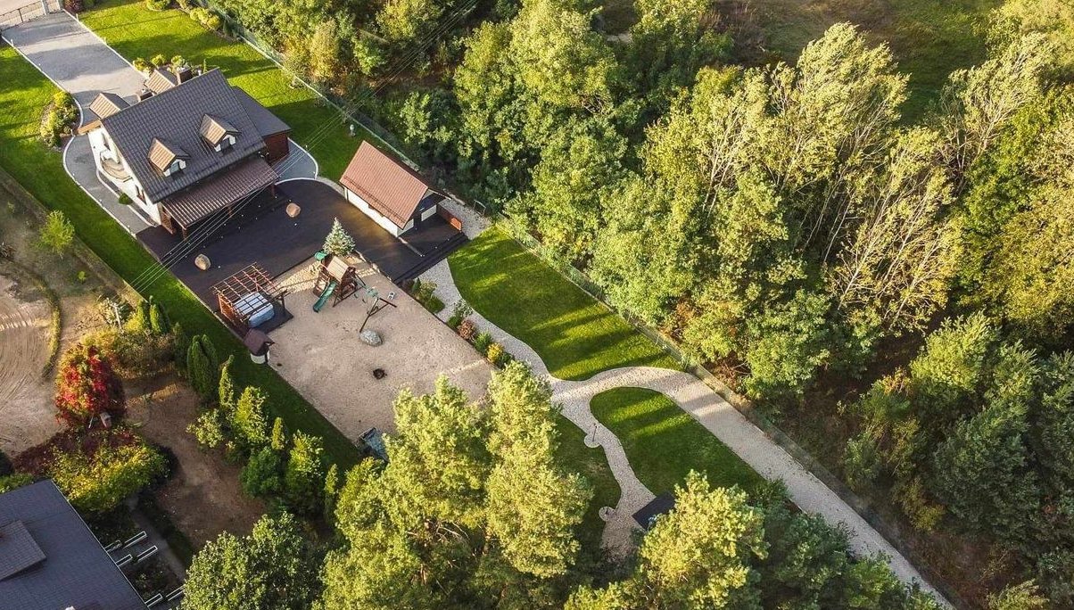 Na działce znajduje się altana, duży taras, plac zabaw dla dzieci, miejsce do grillowania oraz jacuzzi. Ogród jest przepięknie zagospodarowany w drzewa, ozdobne krzewy, kwiaty, elementy dekoracyjne oraz fontannę, oczko wodne, strumyk biegnący po skarpie i wpadający do wcześniej wspomnianego oczka wodnego.