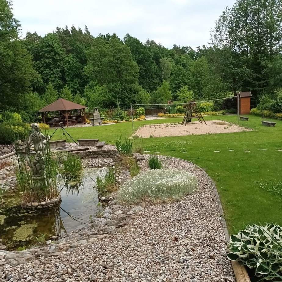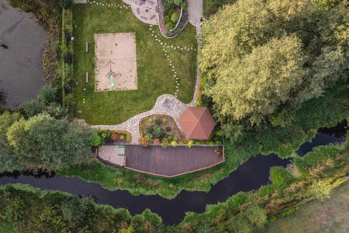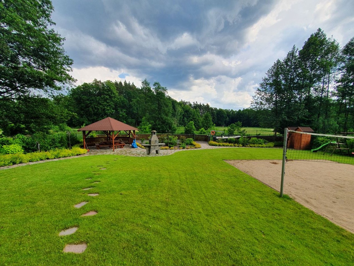 W obrębie działki jest tez rzeczka oraz duży piękny taras. W dolnej części ogrodu znajduje się również grill kamienny, altana grillowa oraz boisko do siatkówki.