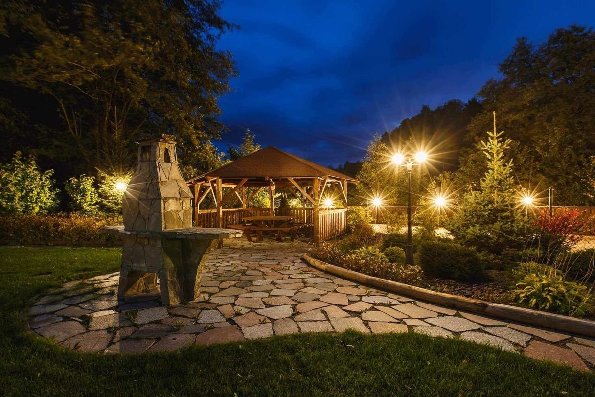 Ogród jest wyposażony w system nawadniający zasilany ze studni głębinowej, a dodatkowego uroku posiadłości dodaje oświetlenie elewacji oraz lampy.