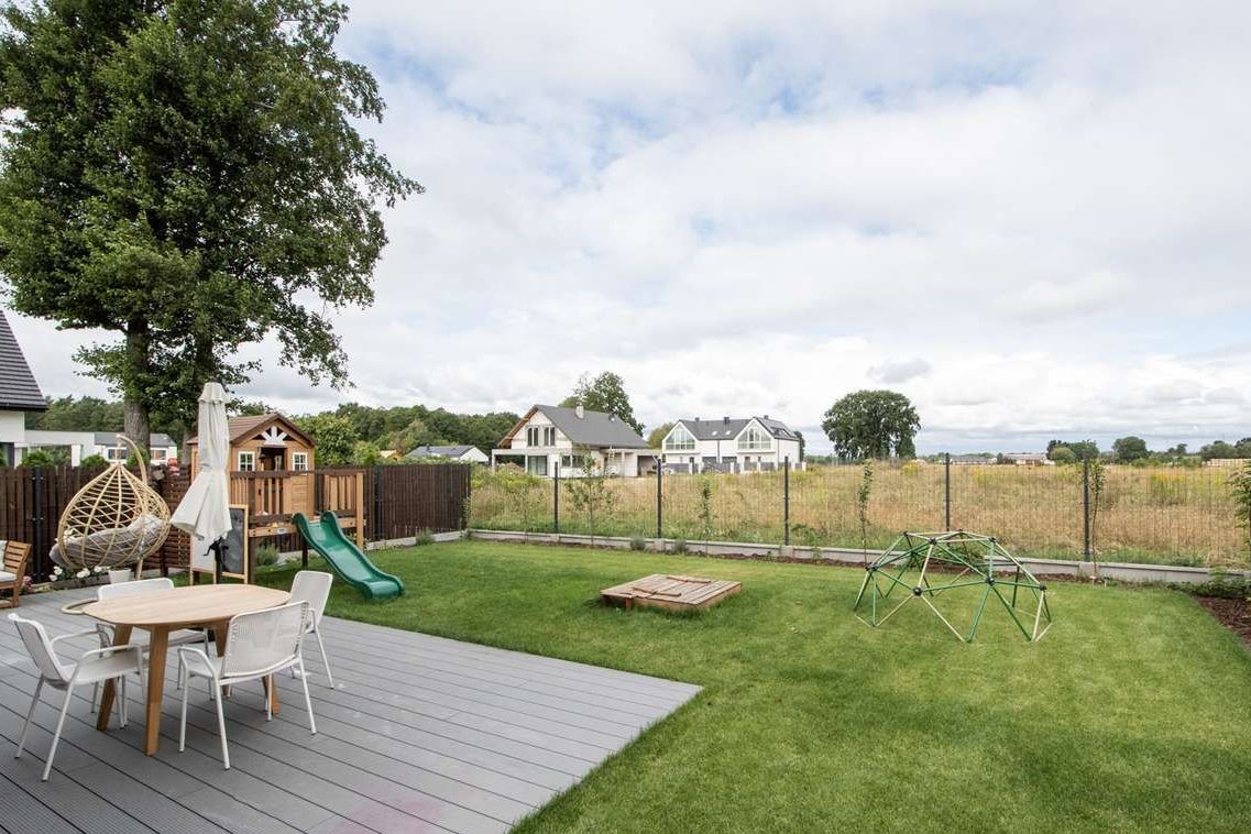 Duży taras i zadbany ogród z wyprowadzonym przyłączem wody oraz kablem elektrycznym to przestrzeń idealna do rodzinnej rekreacji i zabaw. Ogród został praktycznie zagospodarowany z myślą o bezpieczeństwie i wygodzie mieszkańców.