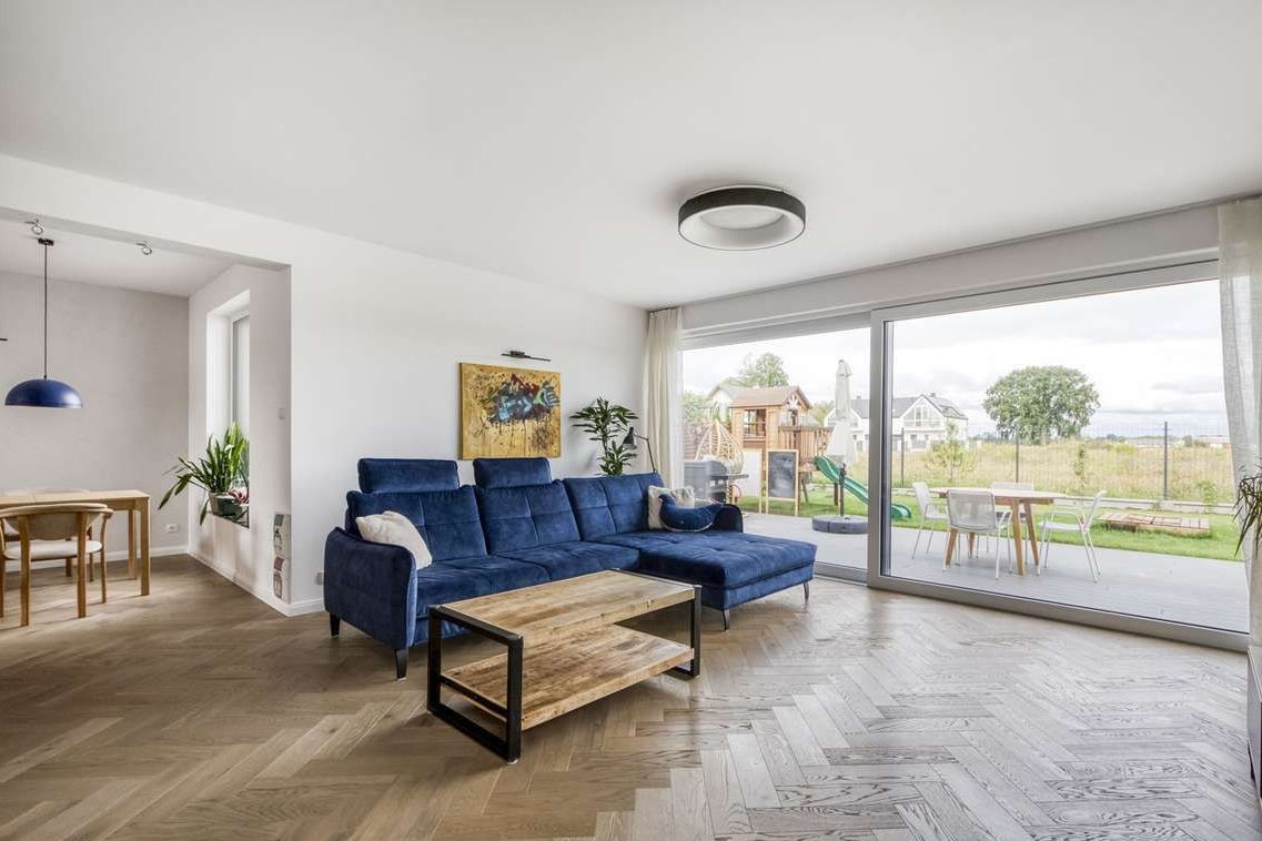 Duże panoramiczne okna gwarantują doskonałe doświetlenie wnętrz naturalnym światłem, tworząc jasną, przestronną i przyjazną atmosferę. Przestronny salon z wyjściem na taras umożliwia integrację strefy dziennej z ogrodem, oferując idealne miejsce na relaks i rodzinne spotkania.