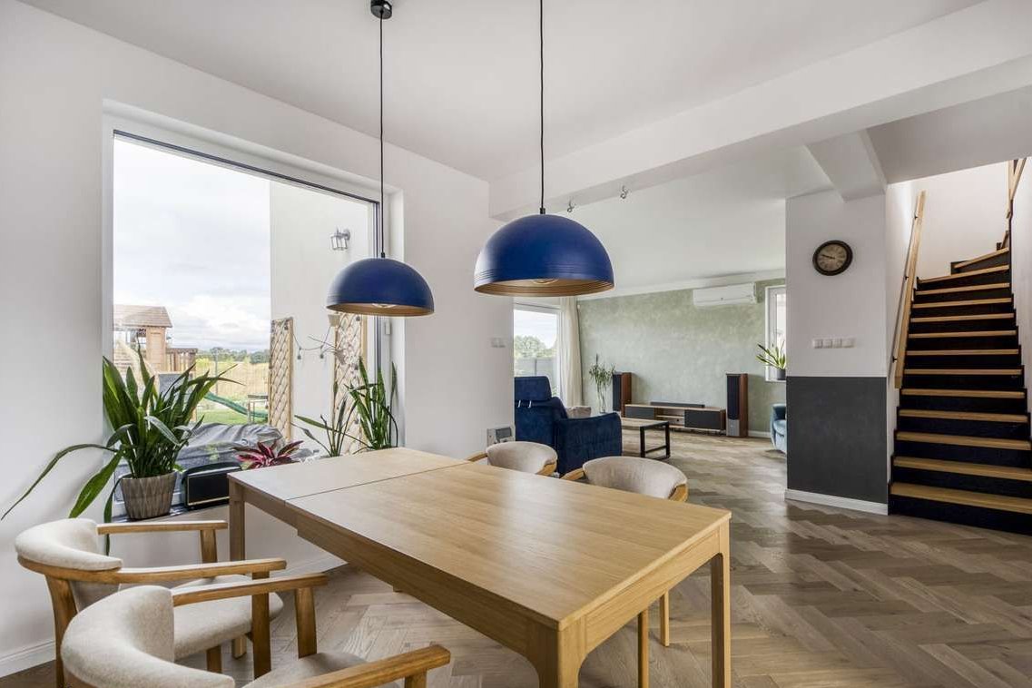 Funkcjonalna, nowocześnie urządzona kuchnia z kamiennym blatem i wydajnym sprzętem AGD połączona jest z przestronną jadalnią, która zapewnia komfort codziennych posiłków oraz spotkań rodzinnych.