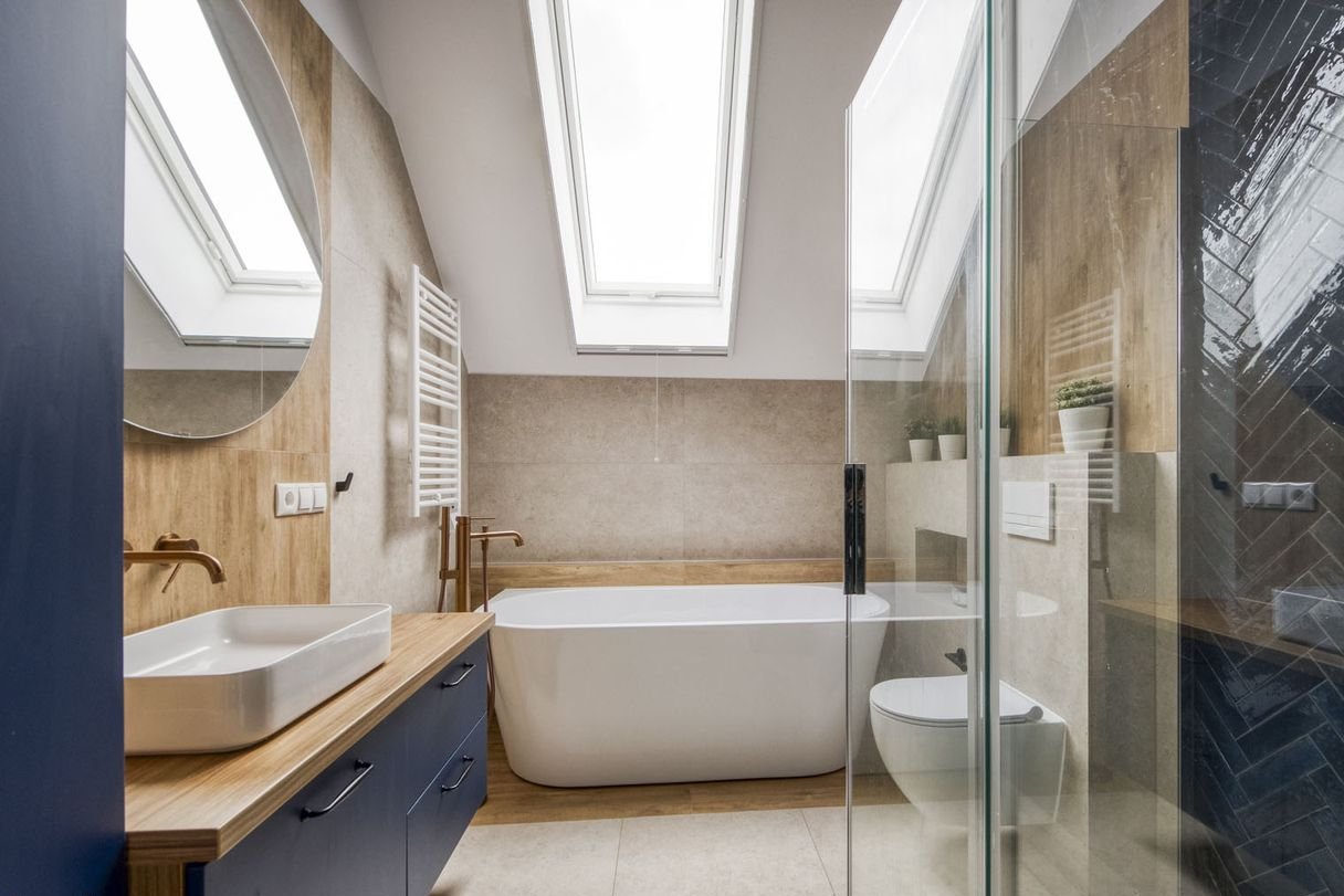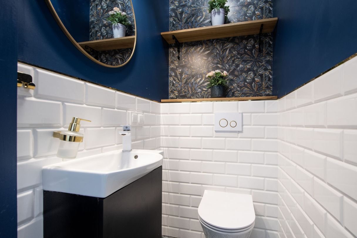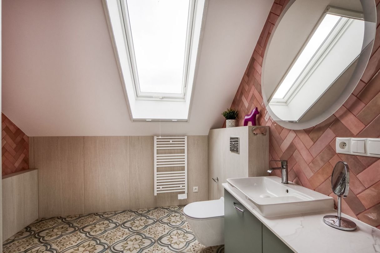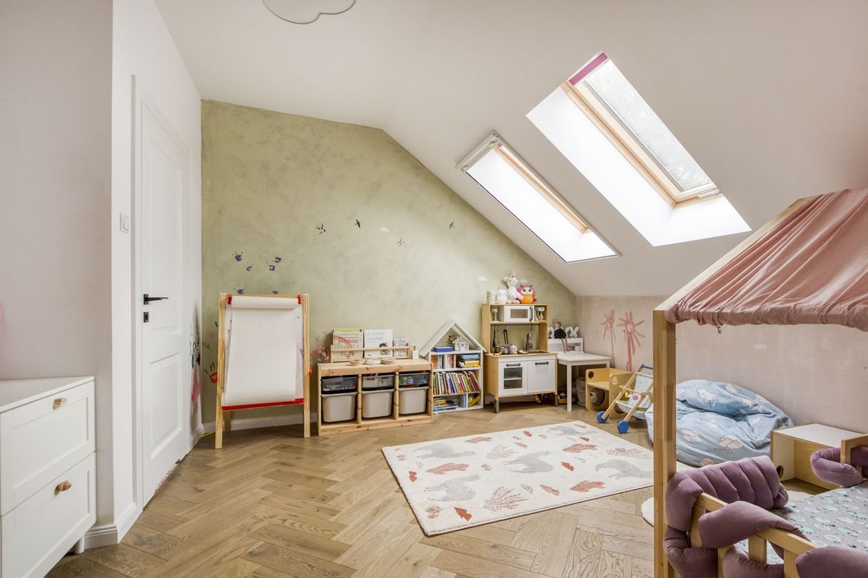 Dwie estetyczne, jasne łazienki na piętrze, w tym jedna z prywatnym dostępem z pokoju dziecięcego, wyposażone w okna dachowe, oraz osobna toaleta na parterze, zapewniają wygodę dla wszystkich domowników.