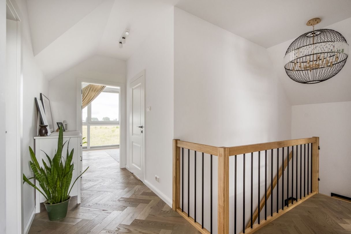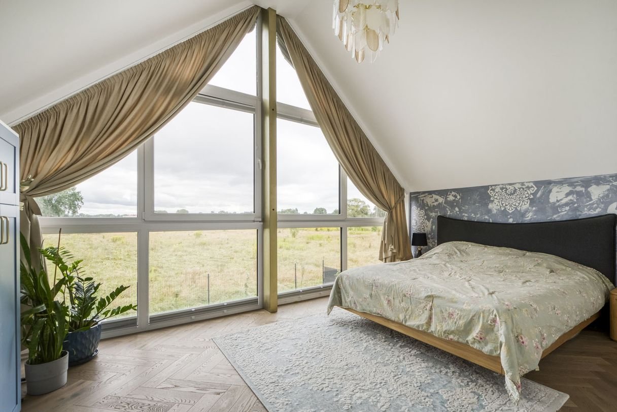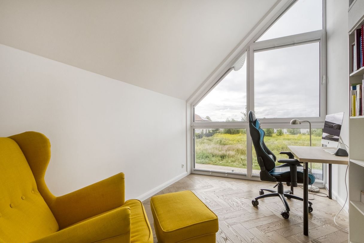W domu są dwa gabinety oraz przestronny pokój dziecięcy, który posiada prywatny dostęp do łazienki. Główna, jasna sypialnia z niezakłóconym widokiem na ogród, wyposażona w ogromne przeszklenia, które tworzą wyjątkową atmosferę spokoju i komfortu.