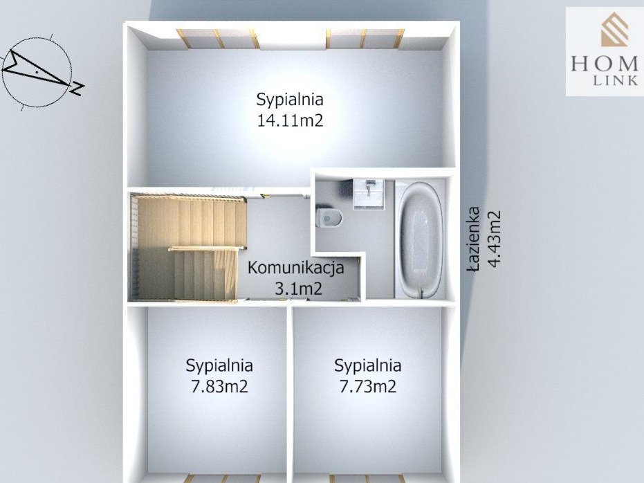 Rozkład pomieszczeń został przedstawiony na rzucie 3D. Dodatkowo zyskujemy jeszcze jedno pomieszczenie, którym jest poddasze domu i nie jest ono ujęte w powierzchnię, gdyż jest zakwalifikowane jako pomieszczenie nieużytkowe, ale idealnie sprawdzi się jako dodatkowe miejsce do przechowywania.