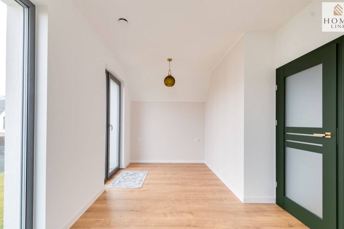 Dom został wybudowany w 2024 roku z betonu komórkowego, ściany zewnętrzne ocieplone dodatkowo styropianem. Dach pokryty jest blachodachówką w kolorze szarym oraz został docieplony wełną mineralną. Elewacja w kolorze białym wraz z szarymi dodatkami. Wnętrze domu to bardzo wysoki standard wykończenia, pomieszczenia wysokie są na odpowiednio: na parterze 2.7m2, na piętrze 2.6m2, zaimplementowana 3-szybową stolarkę okienną, drzwi antywłamaniowe, ogrzewanie podłogowe w każdym z pomieszczeń, wideo-domofon. Ogrzewanie domu realizowane jest za pomocą ekologicznej pompy ciepła marki Bosch (typu monoblok). Budynek został wyposażony również w system rekuperacji, który został zamontowany na strychu. Dom wykończony został pod klucz, co oznacza, że wszystkie pomieszczenia są przygotowane do użytkowania natychmiast, Wysoki standard wykończenia charakteryzuje się kompletnym wykończeniem kuchni w nowoczesne fronty lakierowane wraz ze sprzętem AGD (lodówka, zmywarka i okap w zabudowie), wykończoną łazienka wraz z niezbędną zabudową czy przygotowanymi pokojami do zamieszkania. W domu znajduje się wideomofon, kompletne oświetlenie i przykładowe meble wolnostojące wraz z dekoracjami (które stanowić mogą oddzielny przedmiot rozmów).