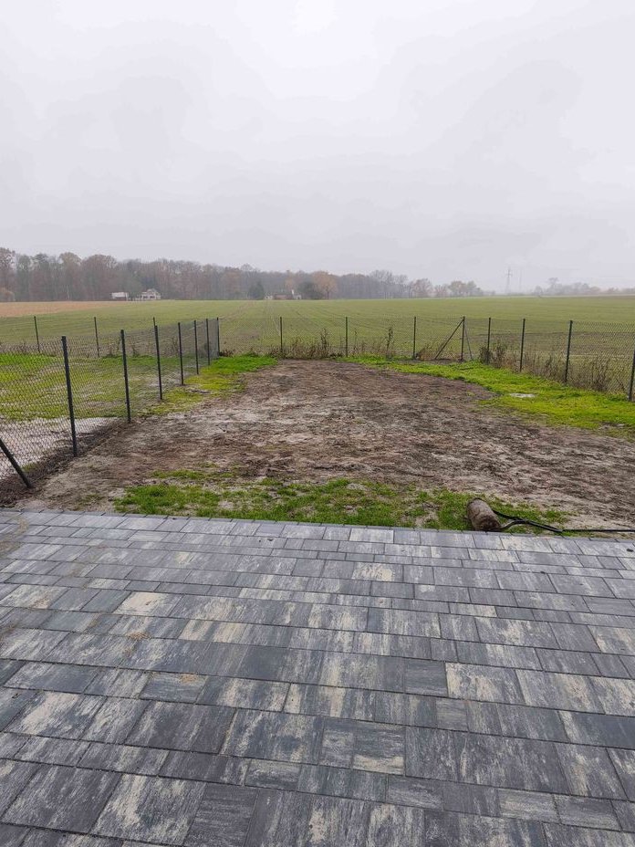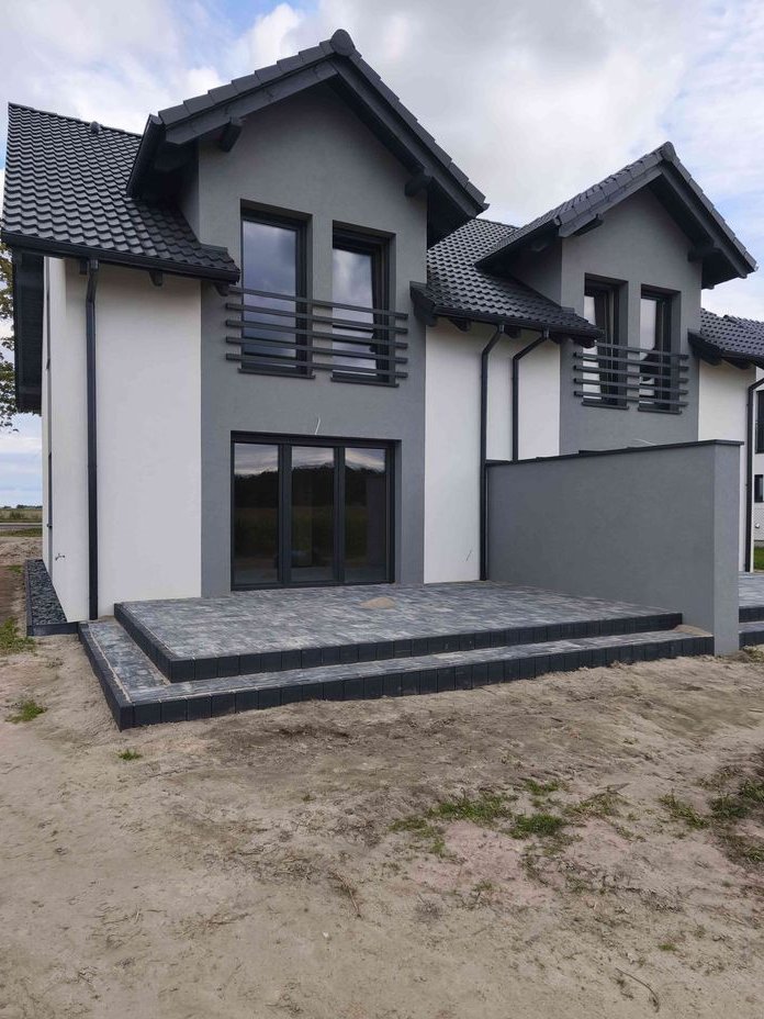 Duże tarasy i miejsce postojowe oraz zbiornik na deszczówkę.