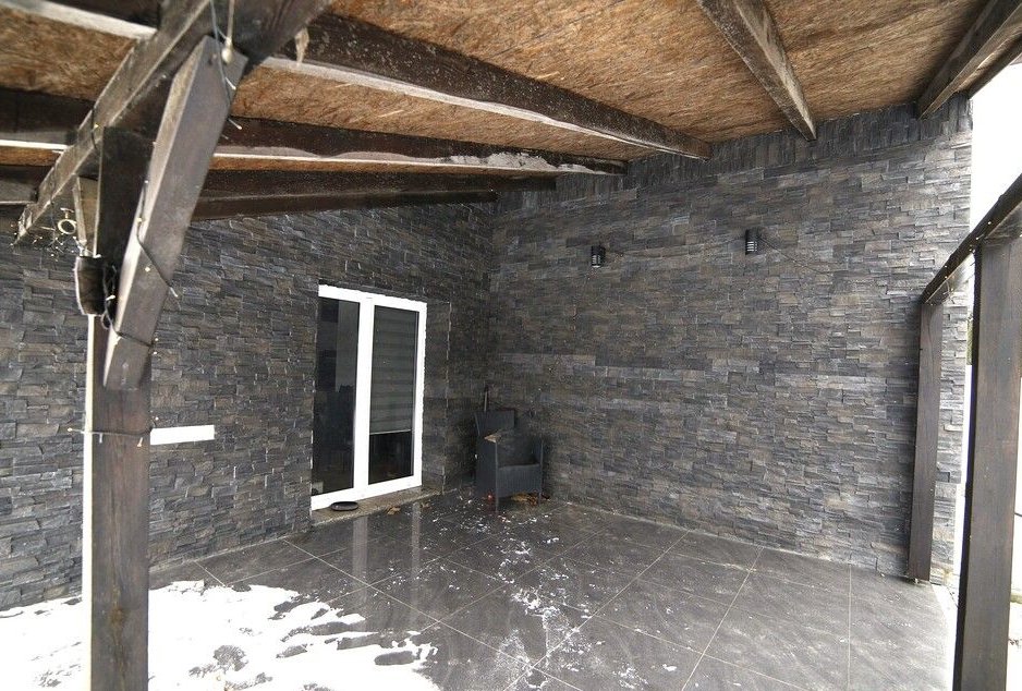 Zadaszony taras – będący jednocześnie wejściem do domu i kuchni od strony podwórza – naturalnie łączy przestrzeń mieszkalną z ogrodem.