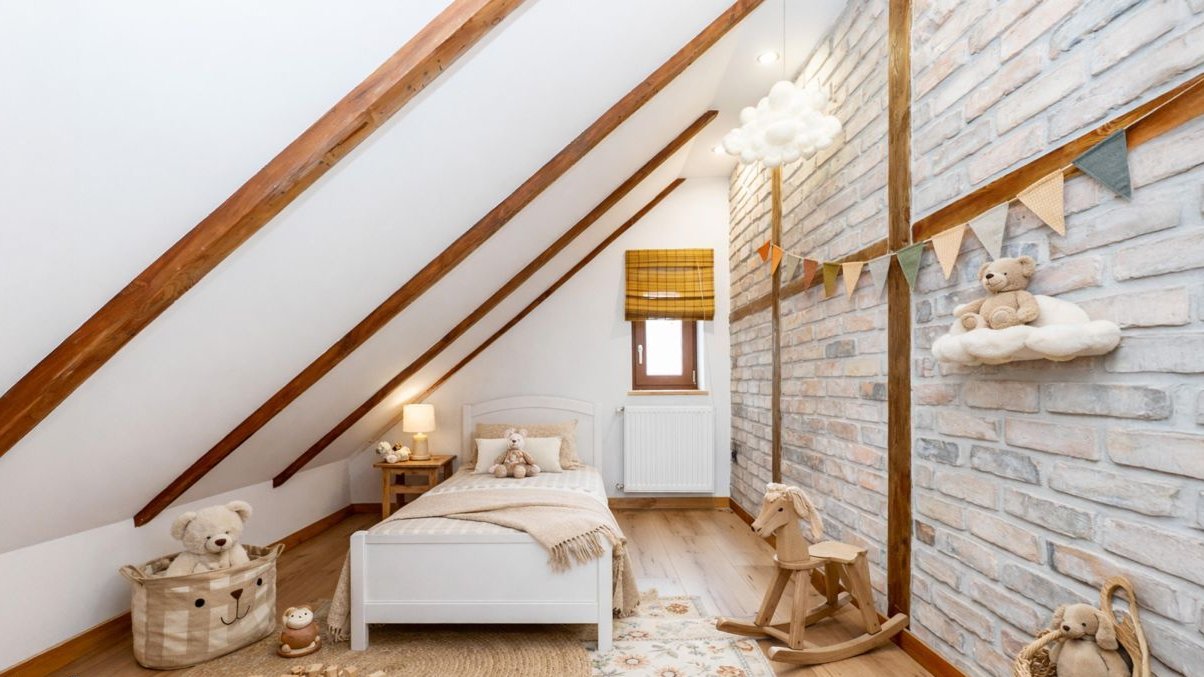 Skosy tworzą przytulność, cegła dodaje charakteru, a przestrzeń pozwala realnie urządzić funkcjonalne pokoje nie mikro sypialnie, ale pełnoprawne strefy prywatne.