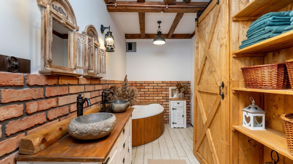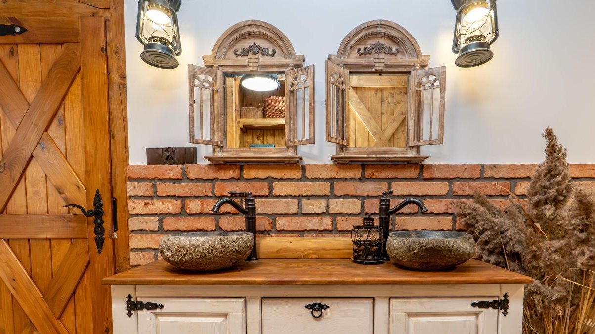 Łazienka z oknem rzadkość, wanna narożna, dwa kamienne zlewy z designerskimi bateriami, dużo miejsca do przechowywania (chemia, detergenty, wiadra wszystko ma swoje miejsce), okno naturalne światło i możliwość przewietrzenia