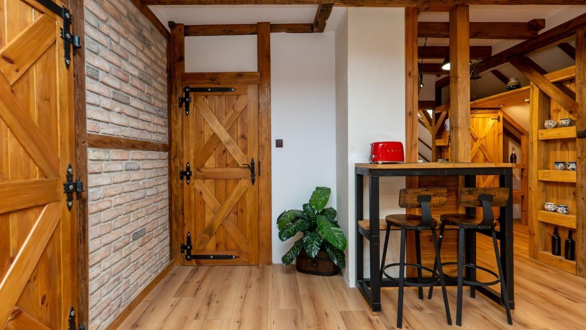 Salon to serce tego miejsca, ok 45 m po podłodze, wysokość w najwyższym punkcie aż 3,70 m. Trzy okna dachowe Velux wpuszczają światło, które wędruje po drewnie obecnym w całym mieszkaniu. Jest tu ciepło, naturalnie, autentycznie. Dodatkowe ogrzewanie typu koza buduje klimat, którego nie da się podrobić wieczór, drewno, światło i cisza pod dachem.