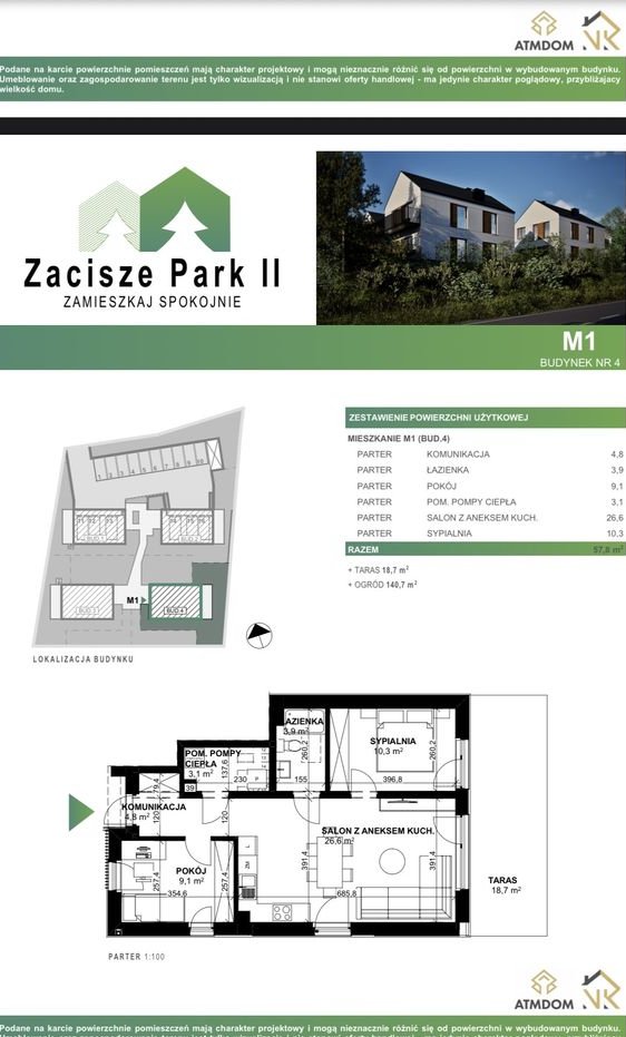 Powierzchnia mieszkania około 57,8m2, powierzchnia ogródka 140,7 m2