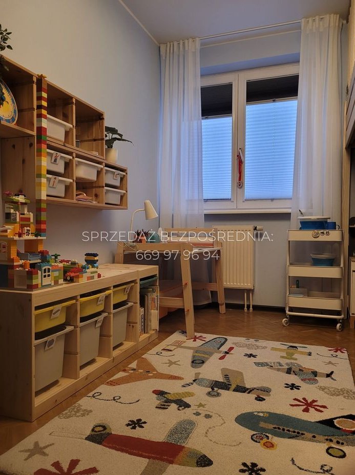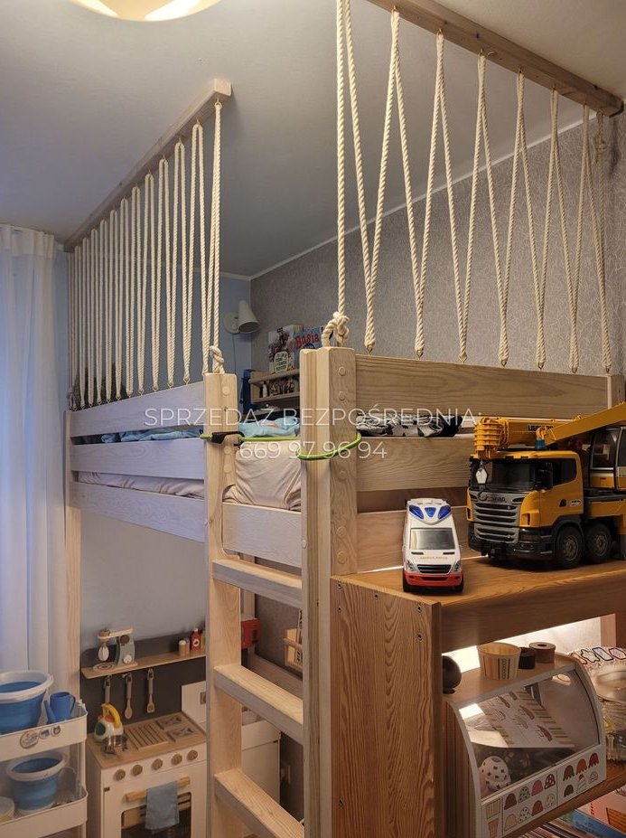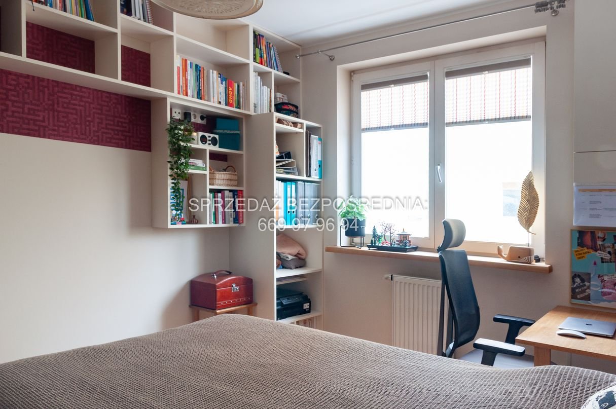 Ponad 25-metrowy widny salon z aneksem kuchennym to przestronna przestrzeń do wypoczynku i relaksu. Jeden z pokoi bez problemu mieści w sobie zarówno sypialnię, jak i przygotowane na wymiar miejsce do pracy zdalnej wraz z biblioteczką. Drugi pokój to, na ten moment, pokój dziecięcy z piętrowym łóżkiem (możemy je zostawić dla nowego małego lokatora).