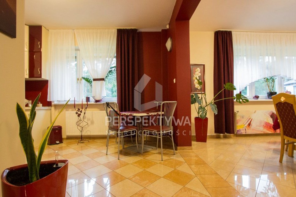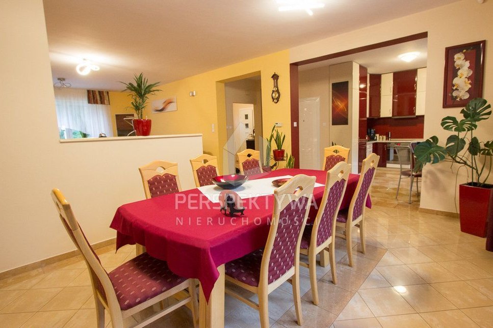 Większa część umeblowania domu pozostaje na wyposażeniu, w tym stała zabudowa (biuro, pokój gościnny, garderoba na piętrze, garderoba w piwnicy, jadalnia), umeblowanie salonu firmy Kler i inne. W nieruchomości pozostaje także kuchnia wraz ze sprzętem: kuchenką z płytą ceramiczną, lodówką (wymienioną w 2025r.), zmywarką i okapem.