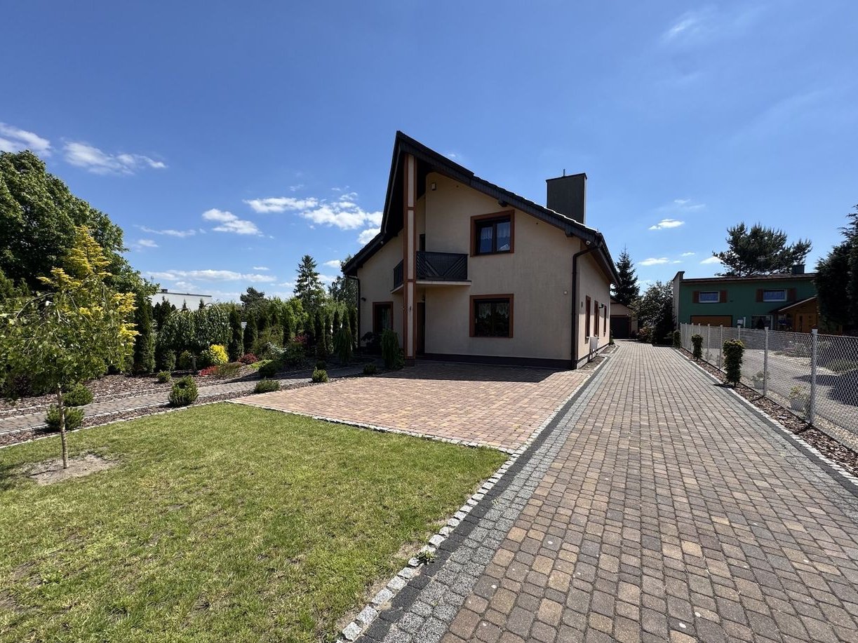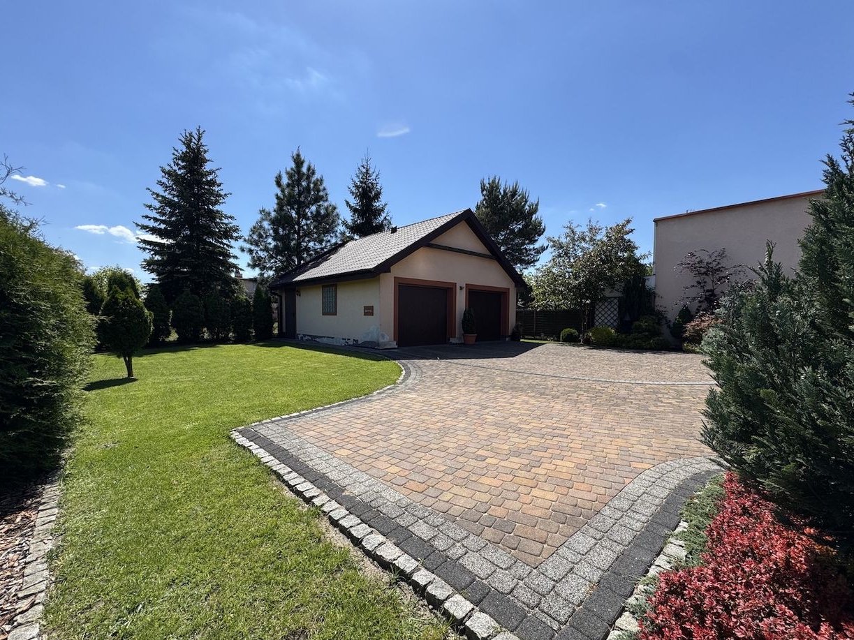 Powierzchnia działki to 1.000m2 (10ar). Cały teren jest ogrodzony, zagospodarowany piękną zielenią i alejkami. Wjazd na posesję przez bramę na pilota. Teren wokół domu wykończony gustowną kostką brukową z odpowiednimi spadami - wg specjalnie zamówionego projektu. Przy garażu – drewutnia i miejsce gospodarcze.