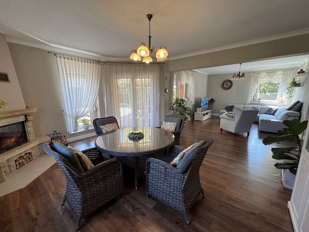 3. Ogromny salon z kominkiem i jadalnią oraz wyjściem na taras.