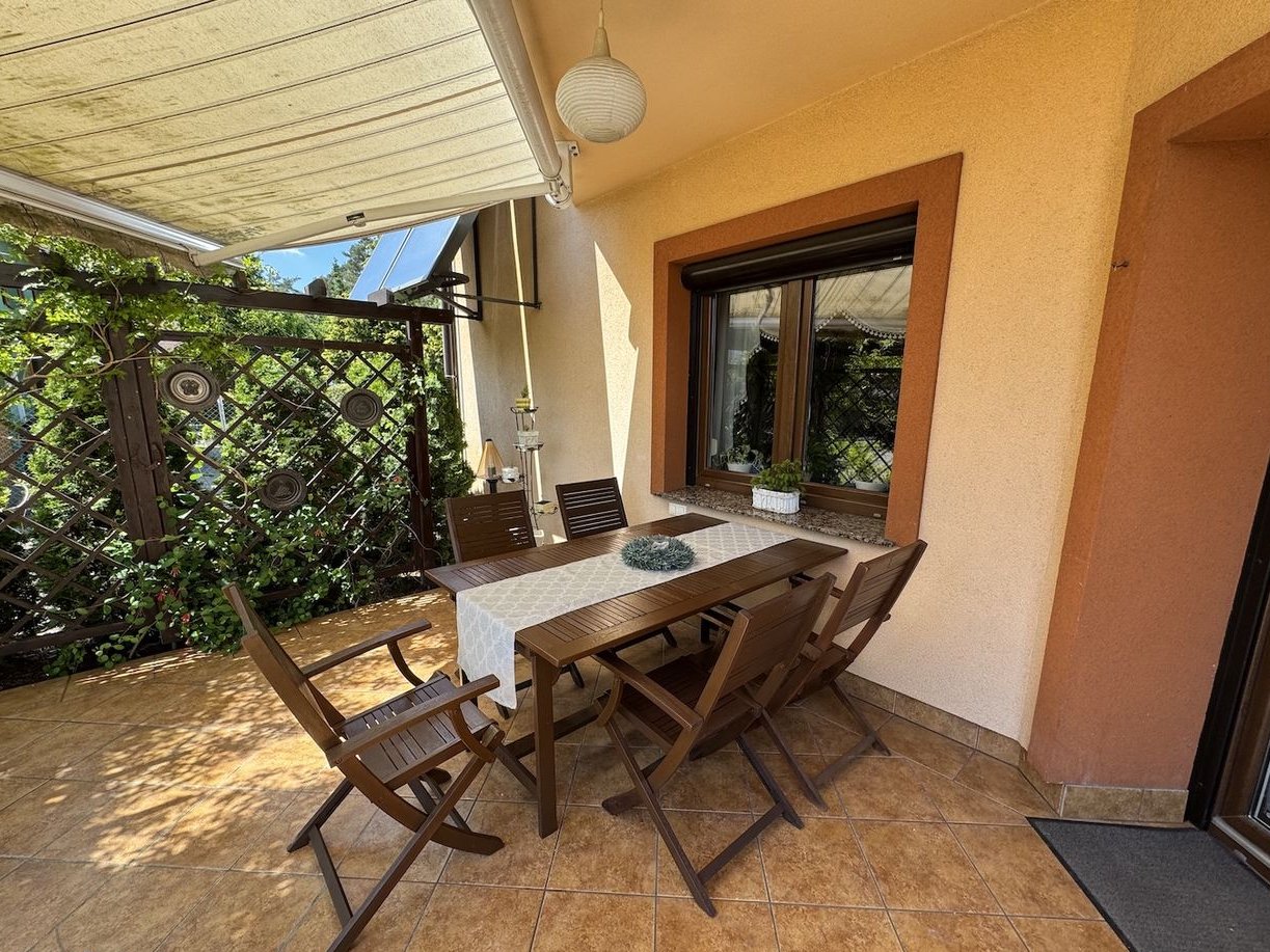 Z tyłu domu znajduje się taras, w którym się zakochasz. Tutaj spędzisz czas od wczesnej wiosny do późnej jesieni, imprezując przy grillu. Taras otulony jest drewnianą pergolą z kwitnącymi bluszczami.